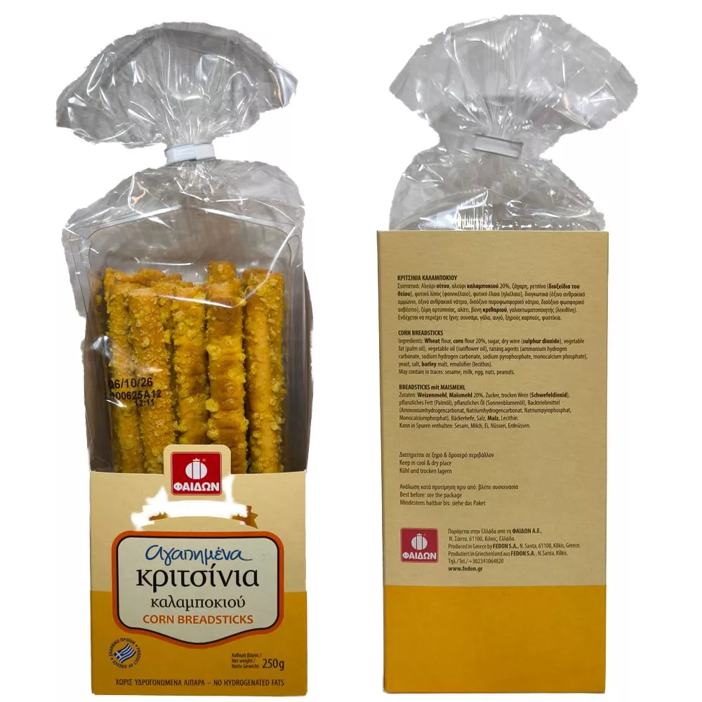 Erleben Sie eine goldgelbe Köstlichkeit aus Nordgriechenland! Die Maiskorn Kritsinia von Fedon bestechen durch ihre einzigartige Farbe und ihren herrlich milden, leicht süßlichen Maisgeschmack. Diese traditionell gebackenen Brotstangen sind die perfekte Wahl für alle, die Abwechslung zu klassischen Weizengebäcken suchen.