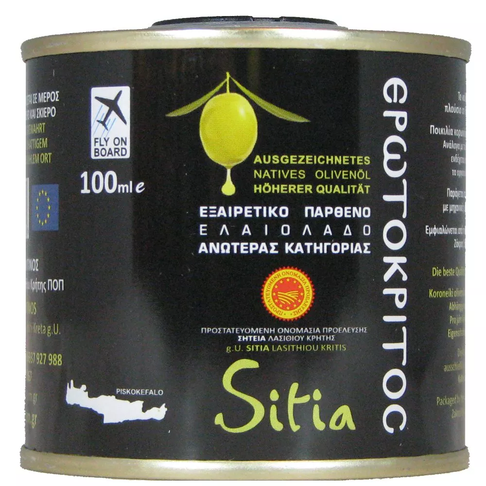Das kretische native Olivenöl extra ist von hoher Qualität, es wurde mehrfach in internationalen Wettbewerben ausgezeichnet und als eines der 50 besten Olivenöle der Welt bezeichnet. Es wird im Osten von Kreta, (Bezirk Sitia, Provinz Lasithi) unter dem günstigen mediterranen Klima Griechenlands angebaut und in rein mechanischer Herstellung produziert. Kaltgepresst unter 27°C. (Erzeugerabfüllung).