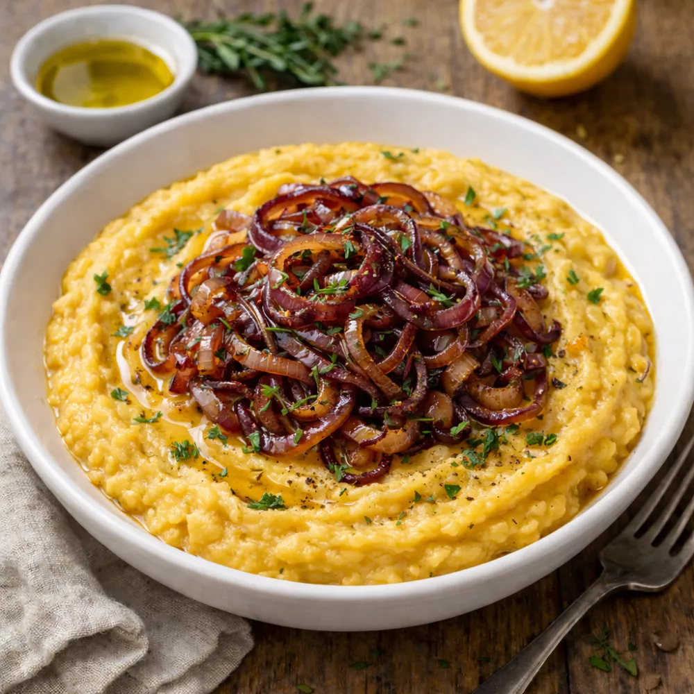 Karamellisierte Zwiebeln zubereiten (optional): Während die Fava kocht, kannst du die karamellisierten Zwiebeln zubereiten. Erhitze 1 EL Olivenöl in einer Pfanne bei mittlerer Hitze. Gib die Zwiebelringe hinzu und brate sie unter gelegentlichem Rühren etwa 10-15 Minuten an, bis sie weich und leicht gebräunt sind. Füge den Zucker und eine Prise Salz hinzu und brate sie weitere 5-7 Minuten, bis sie goldbraun und süß sind. Wenn du möchtest, kannst du am Ende den Rotweinessig hinzufügen und kurz aufkochen lassen, bis er verdampft ist. Dies verleiht den Zwiebeln eine schöne Säure.