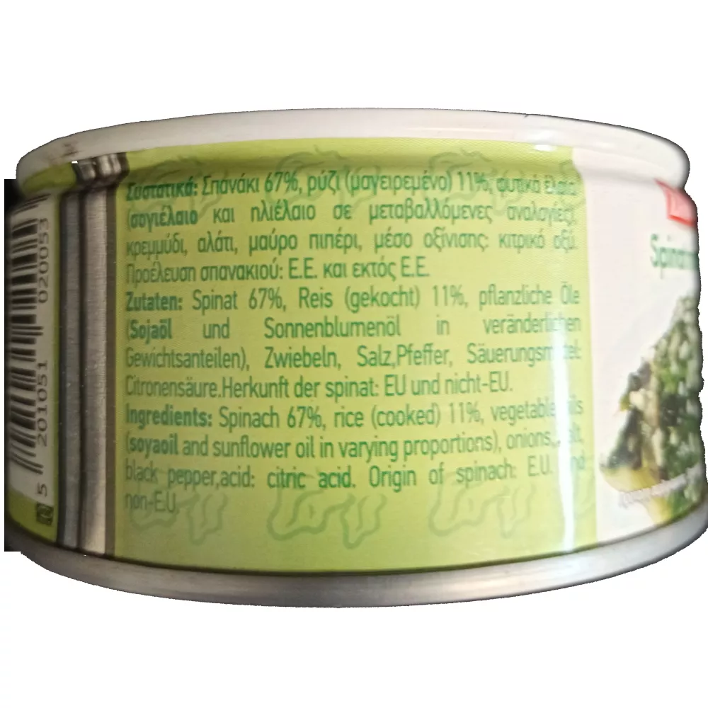 Inhaltsstoffe/ Zutaten: Spinat, Reis, pflanzliche Öle (Sonnenblumenöl und Sojaöl), Zwiebeln, Salz, Pfeffer, Zitronenöl