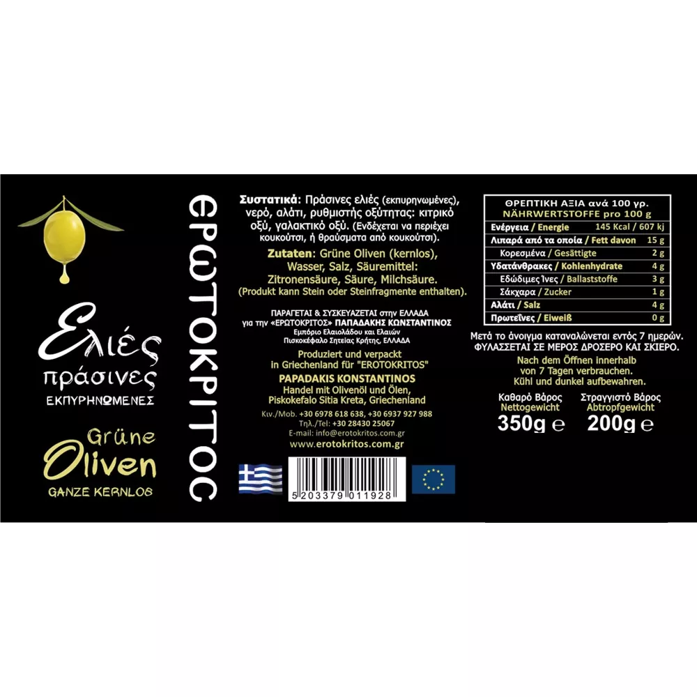 Greek olives green and without core from Crete (drained net weight: 200 g), Erotokritos