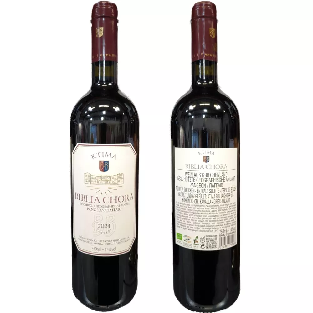 The flagship red wine from Ktima Biblia Chora is a masterpiece from the cool slopes of Mount Pangaio in Kavala. This harmonious blend combines the structure of Cabernet Sauvignon, the velvetiness of Merlot, and the fruity elegance of the Greek Agiorgitiko grape. Most importantly: This wine is certified organic and 100% vegan—pure enjoyment with a clear conscience.