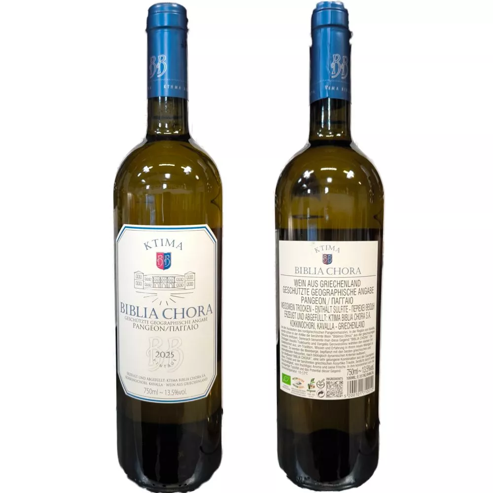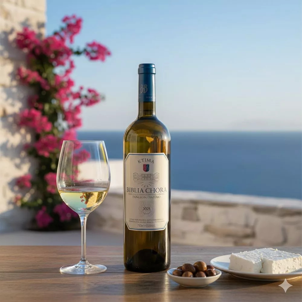 The flagship white wine from Ktima Biblia Chora is one of Greece’s most celebrated blends. Combining the aromatic intensity of Sauvignon Blanc with the powerful, mineral character of Assyrtiko, it creates a unique sensory experience. Grown in the cool highlands of Kokkinochori (Kavala), this wine represents precision and freshness—certified Organic and 100% Vegan.